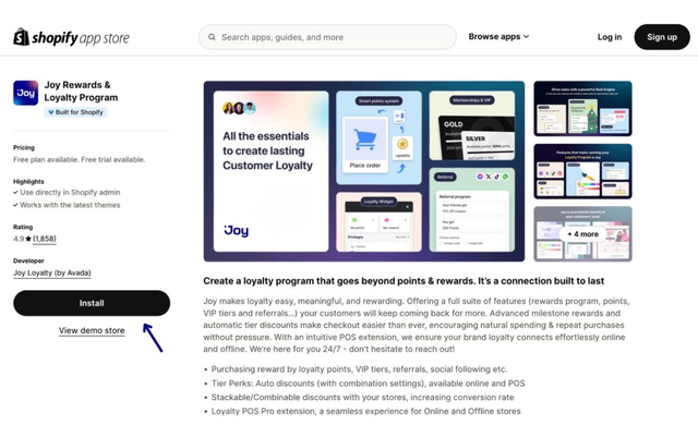 1. Install the Joy Rewards & Loyalty Program App: Begin by installing the Joy Rewards & Loyalty Program from the Shopify App Store. Select a plan based on your store’s needs and referral program goals.