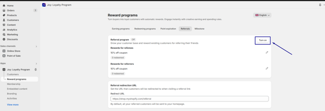 4. Enable the program: Go back to Reward Program > Referrals and click Turn on to live the Referral program and allow customers to get links to share with their friends.