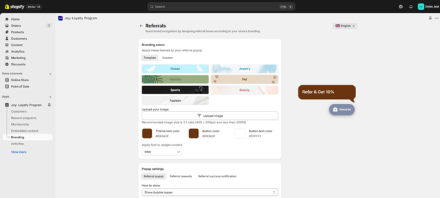 . Customize the Design and Messaging: Go to the Branding section to customize how the referral program will appear on your store, including dedicated pages, pop-ups, or widgets.